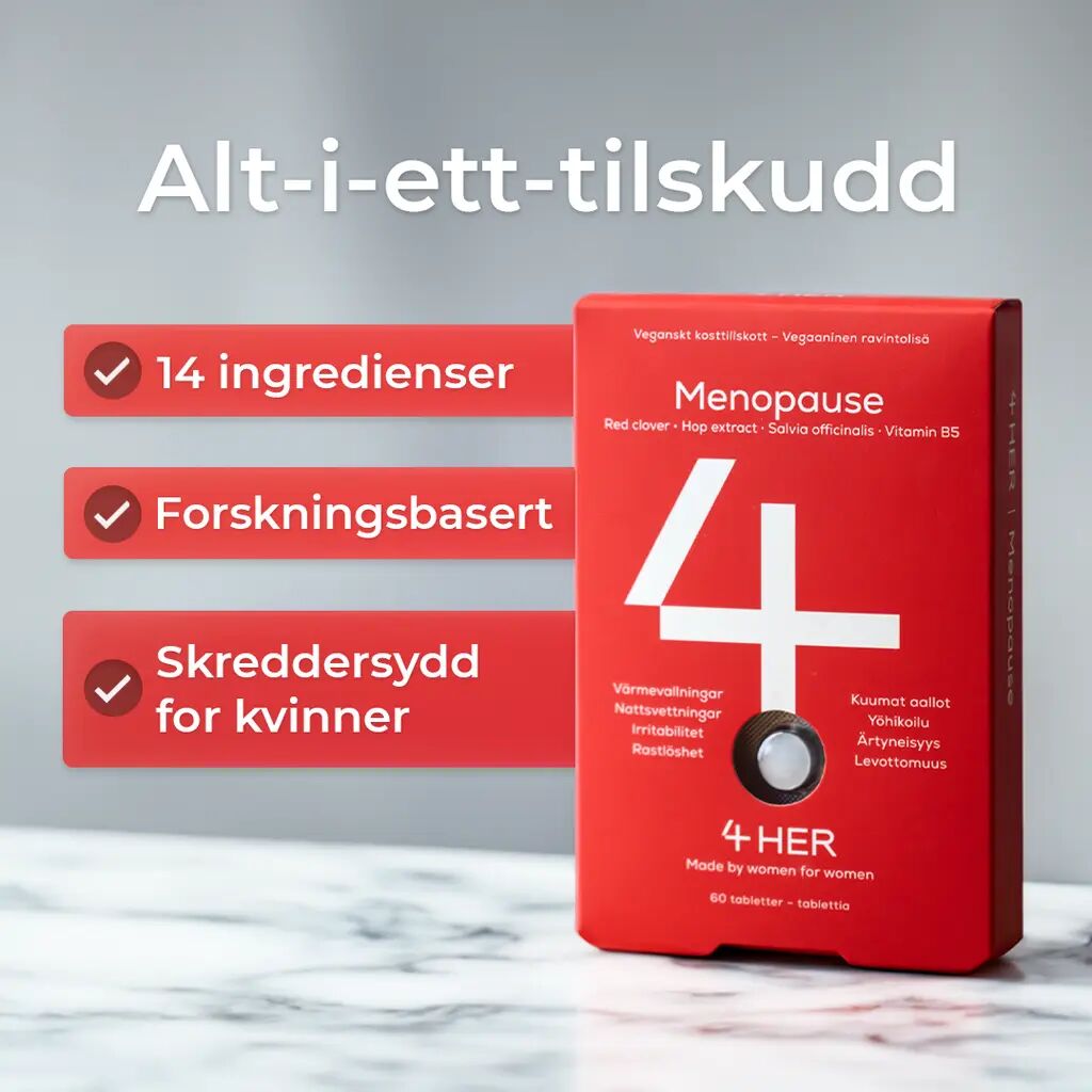 4Her Menopause er et kosttilskudd utviklet for kvinner i overgangsalderen, som kan bidra til en mer behagelig hverdag uten plager som hetetokter og nattesvette.