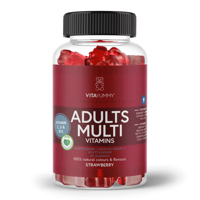 VitaYummy Adults Multivitamins er deilige jordbær-gummivitaminer utviklet spesielt for voksne og barn fra 11 år. De kombinerer viktige vitaminer med naturlige ingredienser og en frisk, fruktig smak, helt uten kunstige tilsetningsstoffer.