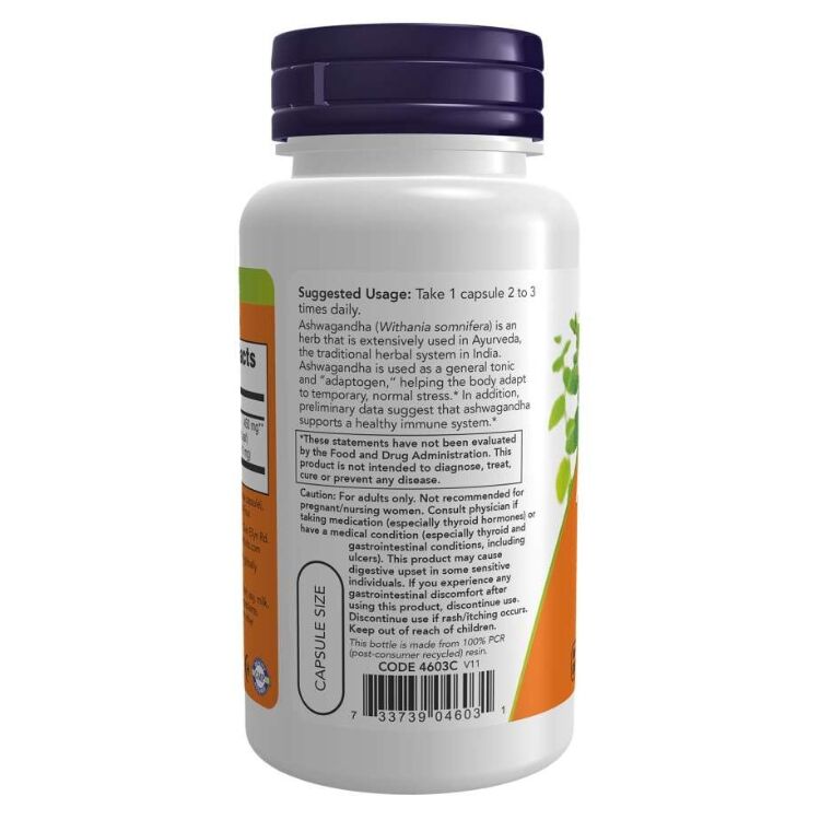 NOW Ashwagandha er et kosttilskudd som inneholder pulver fra roten av ashwagandha, en plante som har vært brukt i tradisjonell ayurvedisk urtekunnskap i lang tid. Produktet inneholder 450 mg ashwagandha per kapsel.