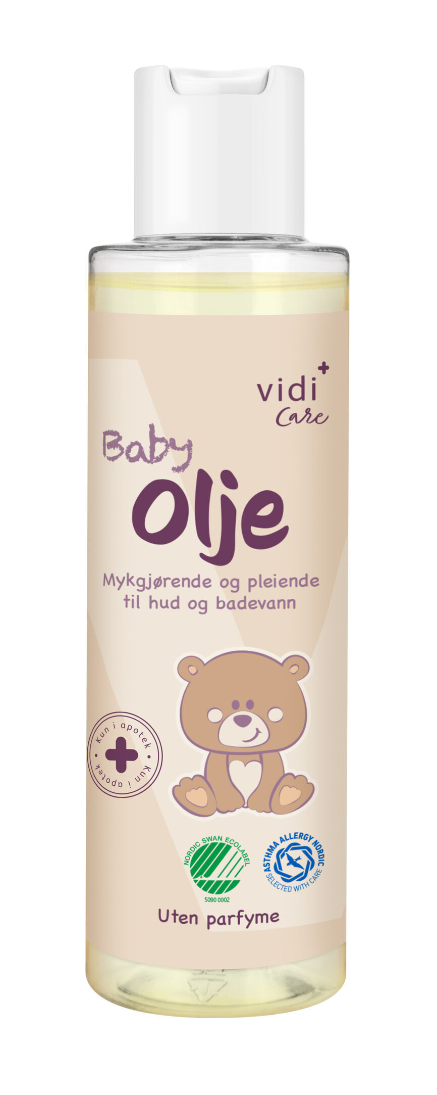 Vidi Care babyolje er en mykgjørende og pleiende hudolje utviklet spesielt for sensitiv babyhud. Oljen kan brukes i badevannet, direkte på tørr hud, til babymassasje og ved behandling av skurv i hodebunnen. Den danner et beskyttende lag på huden som bidrar til å bevare fuktigheten og holde huden myk og smidig.