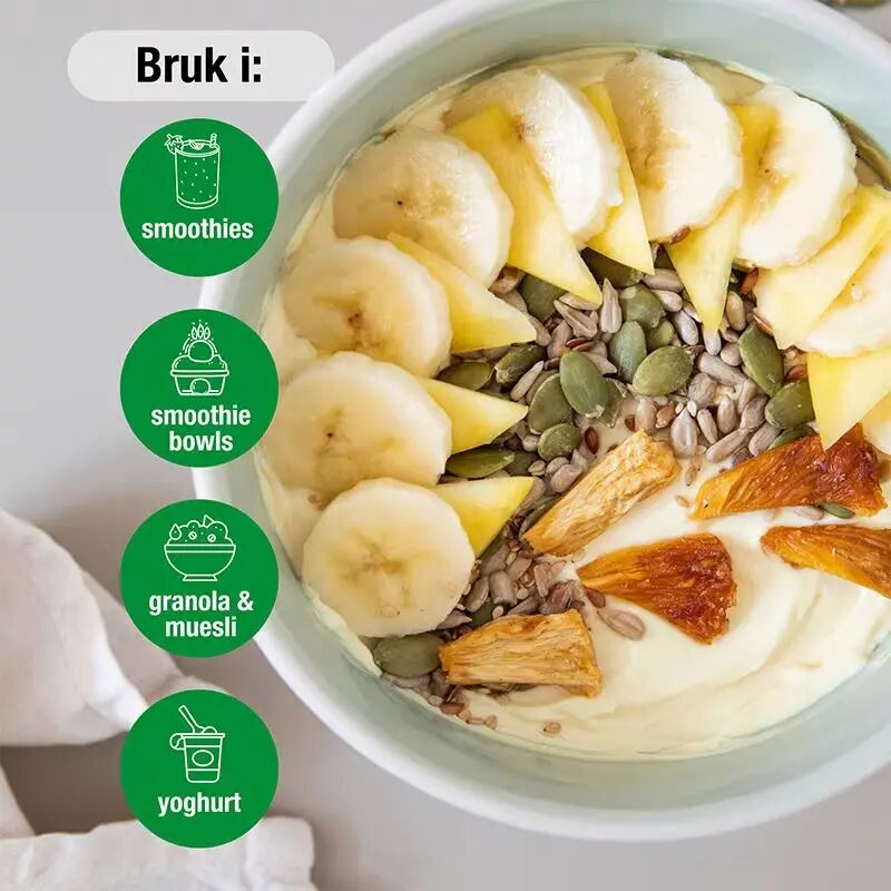 Bipollen er en mild og allsidig ingrediens som passer perfekt på frokostblanding, yoghurt eller grøt og som et næringsrikt tilskudd i smoothie. Produktet er vegansk, økologisk og bearbeidet på en skånsom måte slik at næringsstoffene bevares i sin naturlige form.
