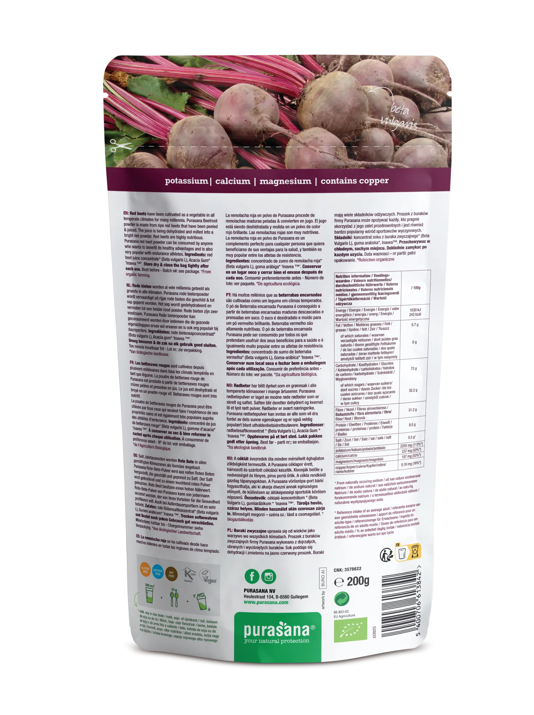 Purasana rødbetpulver er et økologisk og vegansk kosttilskudd laget av modne rødbeter som presses til juice, tørkes og males til et fint, intenst rødt pulver. Denne skånsomme prosessen bidrar til å bevare næringsstoffene fra fersk rødbet, samtidig som du får et praktisk alternativ til rødbetjuice.
