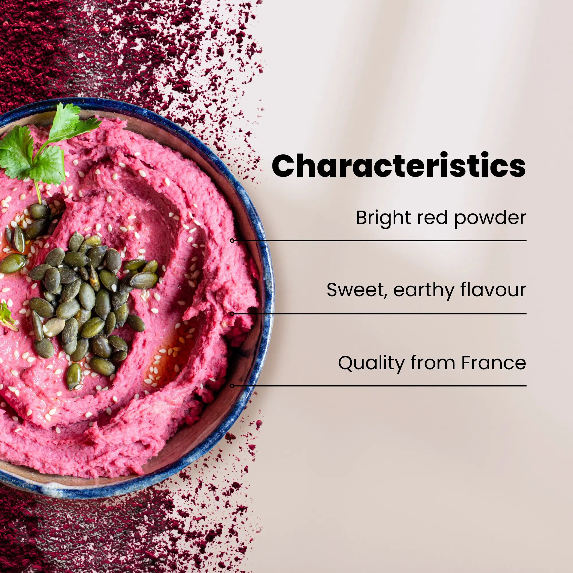 Pulveret har en mild og lett søtlig smak og gir en flott rød farge til smoothies, shakes, fruktjuice og yoghurt. Det er spesielt populært blant utholdenhetsutøvere, men passer for alle som ønsker å inkludere rødbet i kostholdet på en enkel måte.
