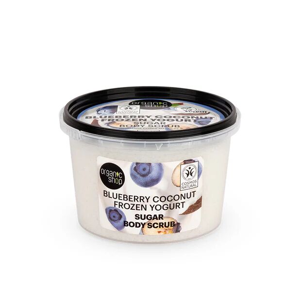 Organic Shop Blueberry Coconut Frozen Yogurt Sugar Body Scrub er en sukkerbasert kroppsskrubb som gir huden en skånsom og velduftende behandling i dusj eller bad. Den fjerner døde hudceller effektivt og etterlater huden glattere, mykere og oppfrisket.