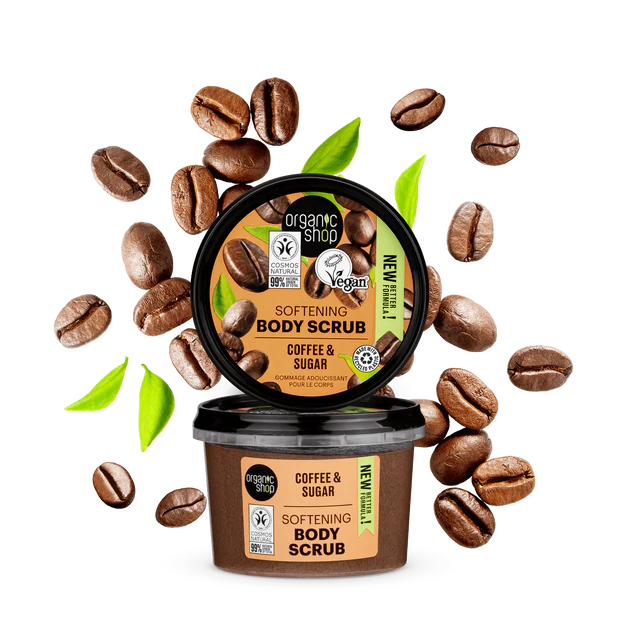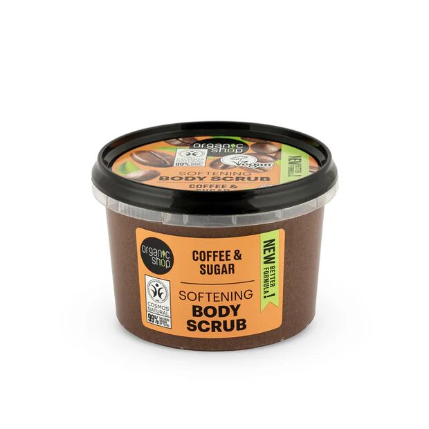 Organic Shop Softening Body Scrub Coffee er en oppfriskende kroppsskrubb som kombinerer sukker og kaffeolje for en effektiv og mykgjørende skrubberutine. Den fjerner døde hudceller skånsomt og etterlater huden glattere, mykere og klar for dagen.