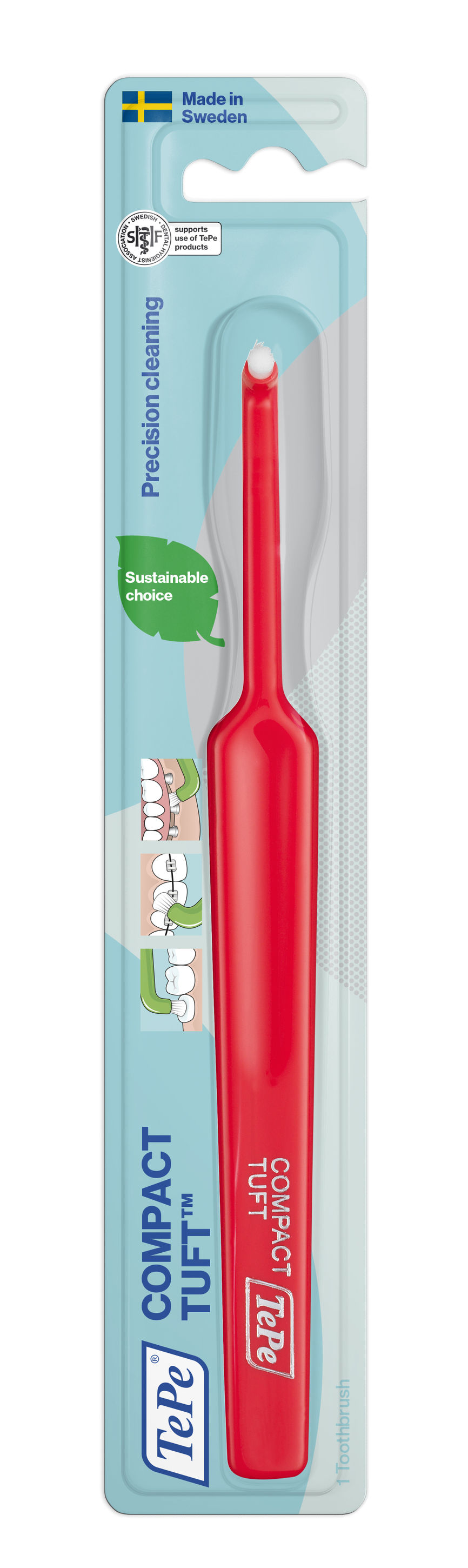 TePe Compact Tuft brukes som et supplement til din vanlige tannpuss for å sikre at ingen områder blir glemt.