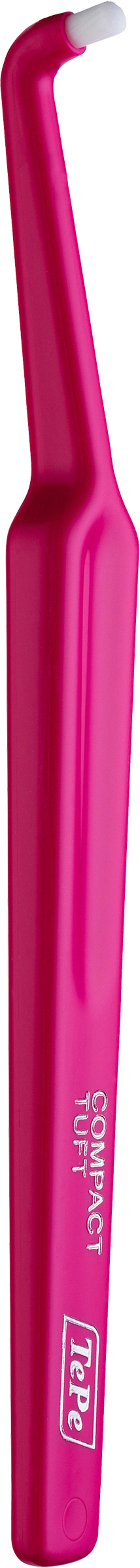 TePe Compact Tuft er en spesialisert vinkelbørste, også kjent som en solobørste, designet for å gi deg maksimal tilgang der den vanlige tannbørsten kommer til kort. Med sitt lille, kompakte og avrundede børstehode er den et uunnværlig verktøy for grundig rengjøring langs tannkjøttkanten og på andre vanskelig tilgjengelige overflater i munnhulen.
