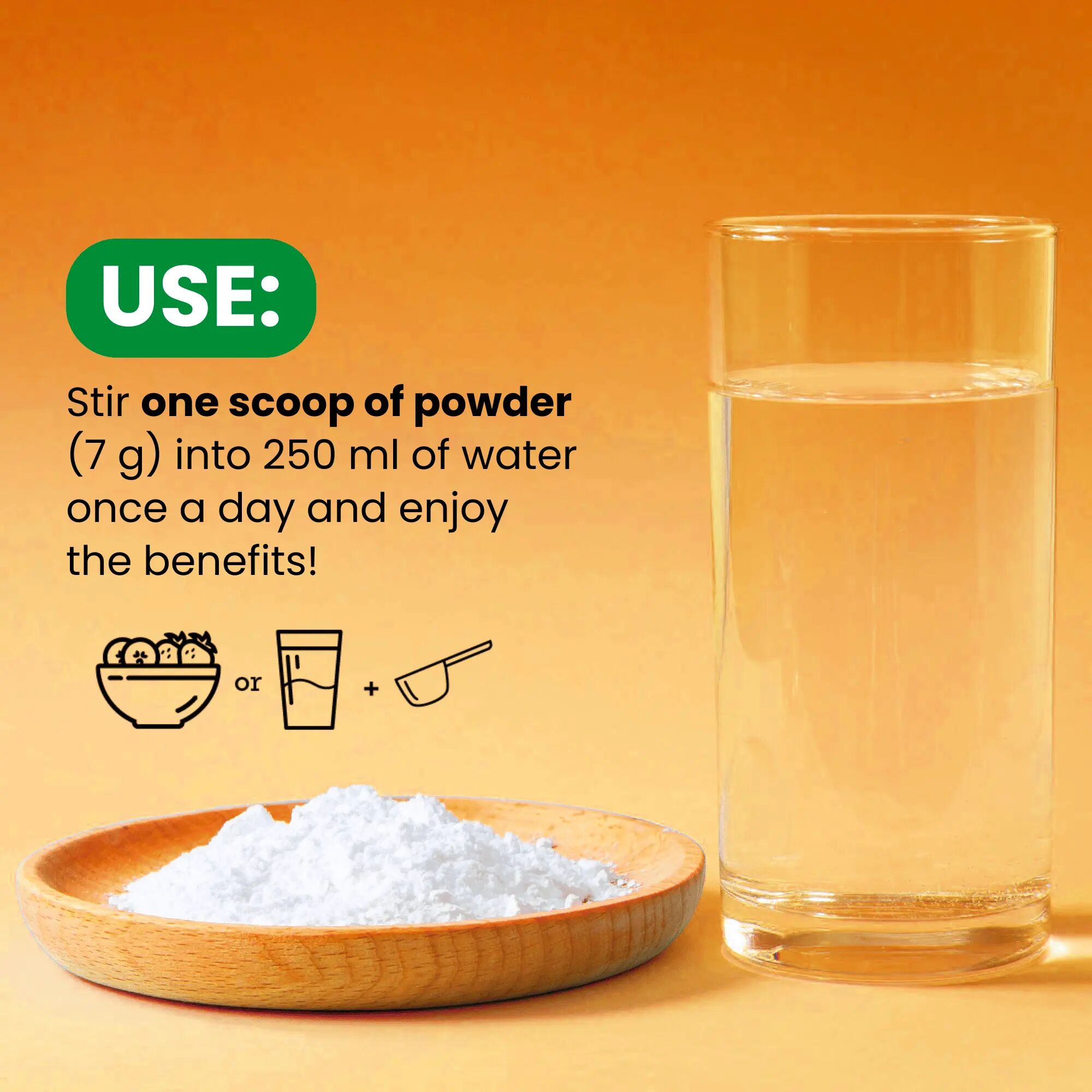 1 strøken måleskje (7 g). Blandes ut i 250 ml vann eller en smoothie, shake eller te.
