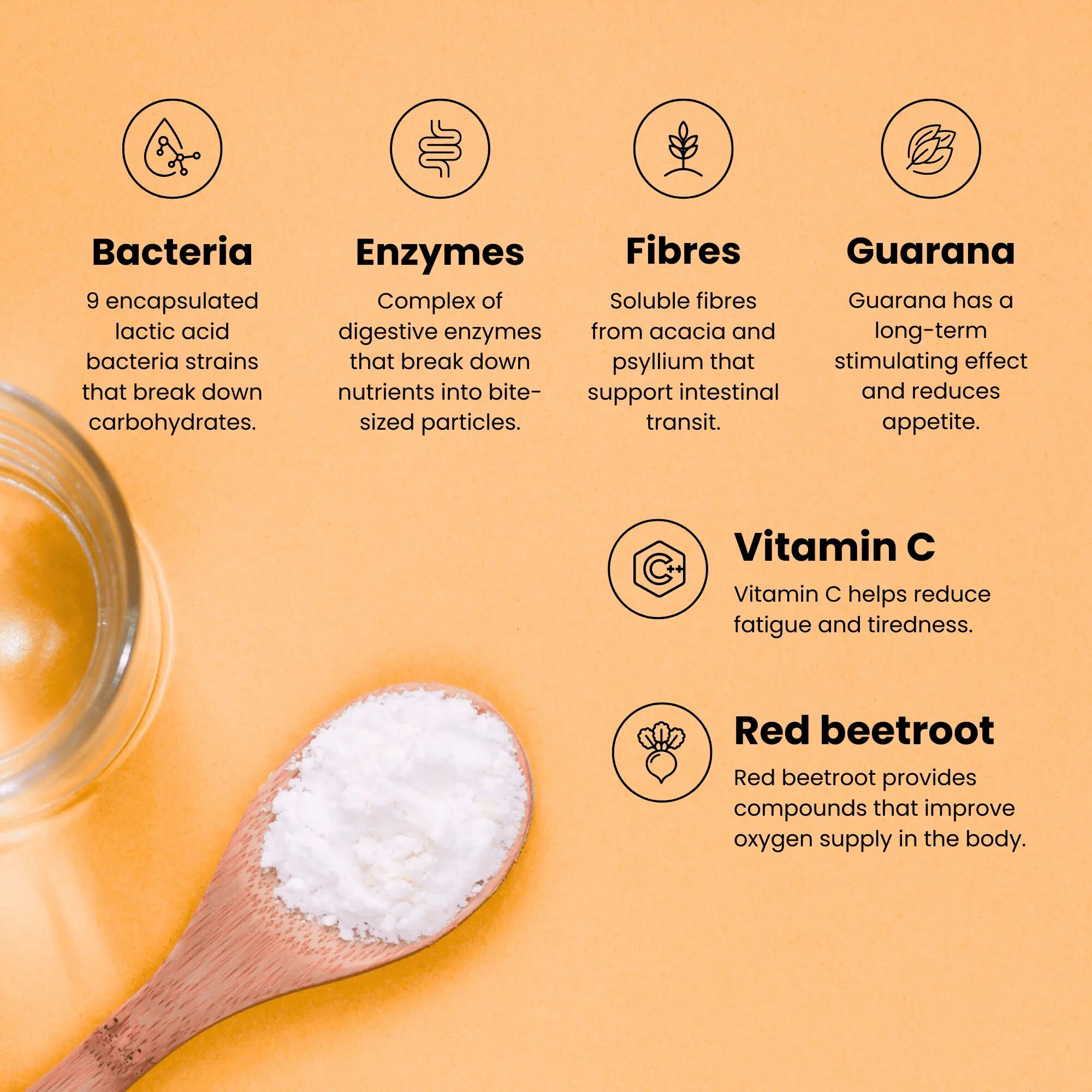 Akasiegummi (Acacia seyal - gummi), blanding av melkesyrebakterier 1x10⁹ CFU (stivelse, maltodekstrin, Bifidobacterium lactis W51-52, Lactobacillus plantarum W1-W21, Enterococcus faecium W54, Lactobacillus acidophilus W22, Lactobacillus paracasei W20, Lactobacillus salivarius W24, Lactococcus lactis W19), konsentrert solbærpulver (Ribes nigrum - frukt), guaranaekstrakt (Paullinia cupana - frø), naturlig solbæraroma, psylliumpulver (Plantago ovata - frø), rødbetejuicepulver (Beta vulgaris - frukt), kalsiumaskorbatdihydrat (vitamin C), enzymblanding (amidone, protease, alfa-amylase, laktase, glukoamylase, bromelain, papain, lipase, cellulase, alfa-galaktosidase).