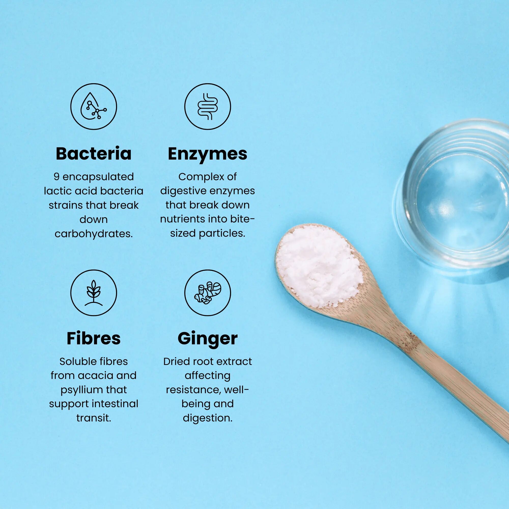 Akasiegummi (Acacia seyal - gummi), blanding av melkesyrebakterier 1x10⁹ CFU (stivelse, maltodekstrin, Bifidobacterium lactis W51-52, Lactobacillus plantarum W1-W21, Enterococcus faecium W54, Lactobacillus acidophilus W22, Lactobacillus paracasei W20, Lactobacillus salivarius W24, Lactococcus lactis W19), naturlig sitronsmak, konsentrert sitronjuicepulver (Citrus limon - frukt), psylliumpulver (Plantago ovata - frø), tørket ingefærekstrakt (Zingiber officinalis - rotstokk), enzymblanding (amidone, protease, alfa-amylase, laktase, glukoamylase, bromelain, papain, lipase, cellulase, alfa-galaktosidase).