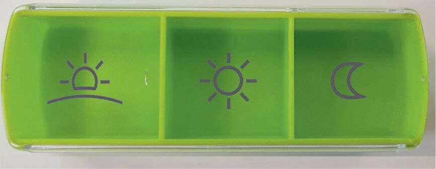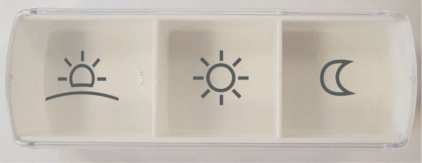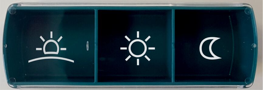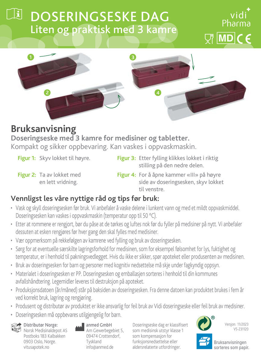 Vidi dosett liten er en kompakt og praktisk doseringsboks med tre separate kamre for trygg oppbevaring av medisiner og kosttilskudd. Den passer godt i veske, lomme eller sekk, og er et godt valg for deg som trenger en enkel løsning til kortere perioder eller daglig bruk på farten.