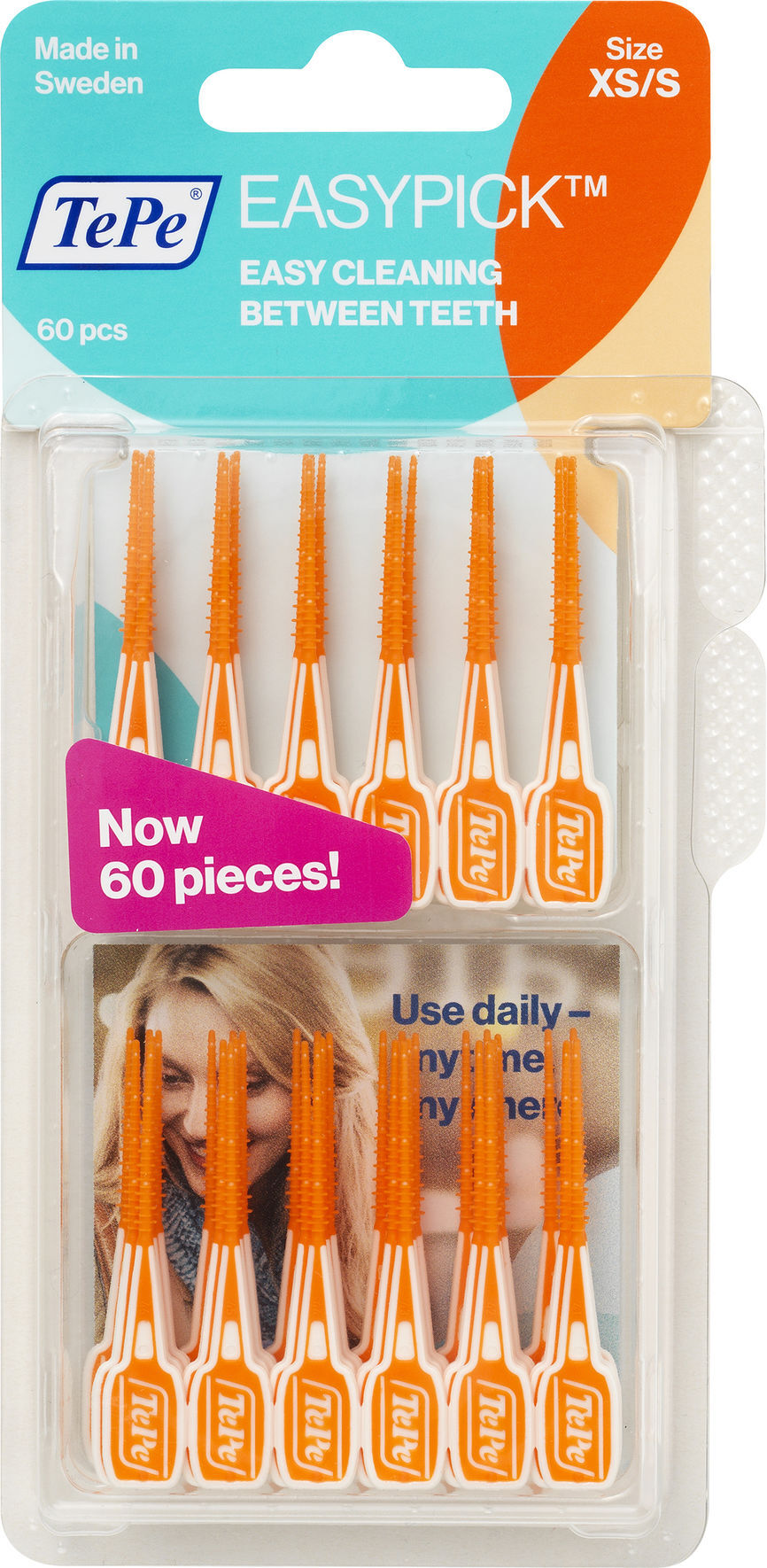 EasyPick™ i størrelse X-Small/Small (oransje farge) er spesielt utviklet for trange til svært trange mellomrom. Den fleksible kjernen gjør at du enkelt kommer til både mellom de fremste tennene og de bakerste jekslene uten at pirkeren knekker. Silikonlamellene masserer i tillegg tannkjøttet, noe som øker blodsirkulasjonen og bidrar til et sunnere tannkjøtt. Den er helt trygg å bruke dersom du har tannregulering, implantater, kroner eller broer. Produktet er utviklet i nært samarbeid med tannpleieeksperter og produseres i Sverige.