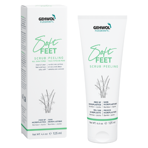 GEHWOL Fusskraft Soft Feet Scrub fjerner skånsomt og effektivt døde hudceller, samtidig som huden fornyes og etterlates glattere. Naturlig bambuspulver og jojobaolje voks gir en behagelig peelingmassasje som stimulerer blodsirkulasjonen, mens sukkerkrystaller bidrar til å rense huden i dybden og gi ny glød.