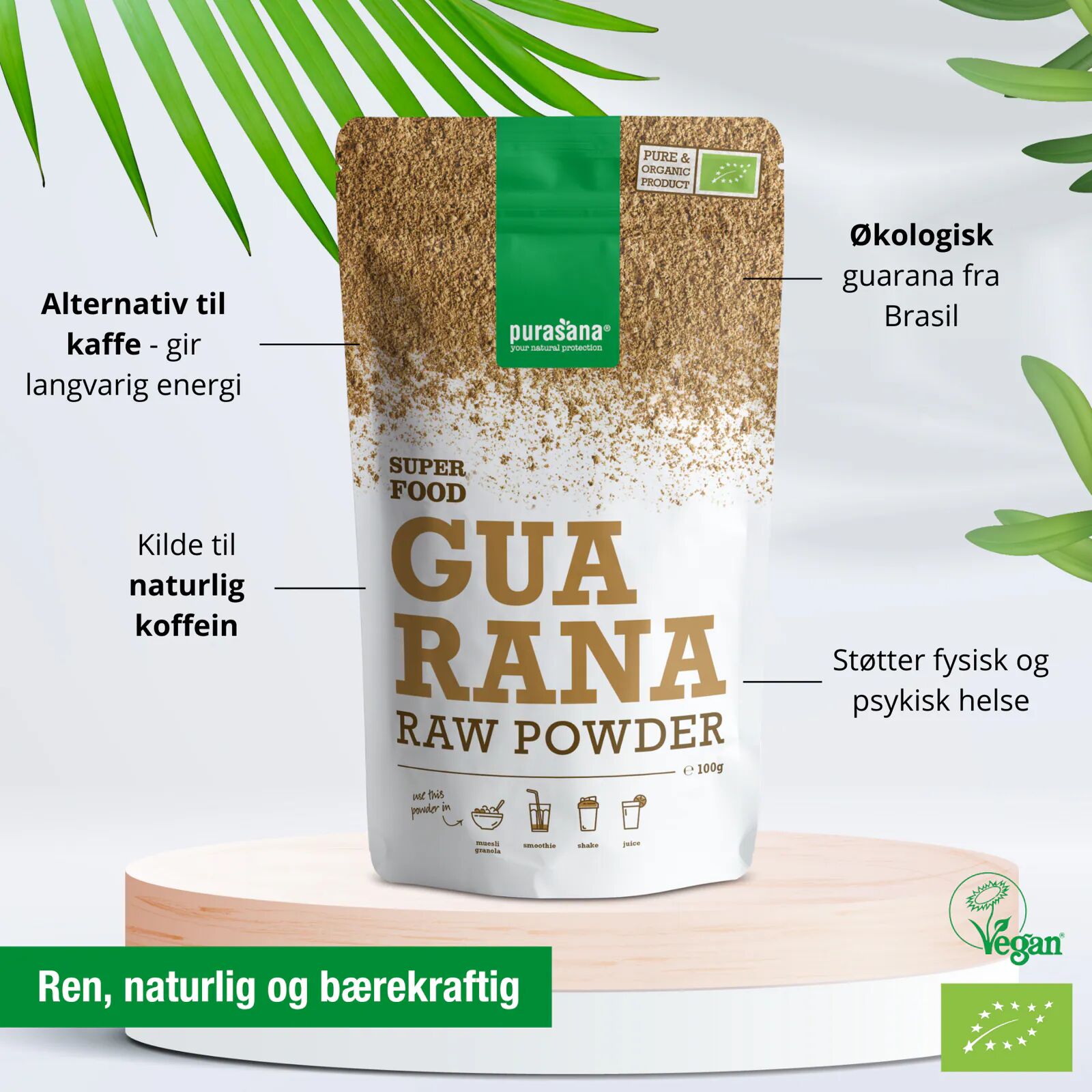 Dette er et 100 prosent rent, økologisk og raw guarana pulver laget av frøene fra Paullinia cupana som vokser i Amazonasregionen. Pulveret har et naturlig innhold av guaranin som kan minne om koffein men absorberes langsommere som gjør at effekten kan kjennes jevnere og mer langvarig. Produktet er helt uten sprøytemidler, kjemikalier, fyllstoff, fargestoffer, smakstilsetninger, konserveringsmidler og andre unaturlige tilsetninger. Guarana har lange tradisjoner i brasiliensk folkemedisin og passer godt for deg som ønsker mer energi og fokus i hverdagen for eksempel i en energismoothie. Anbefales ikke til barn og gravide.