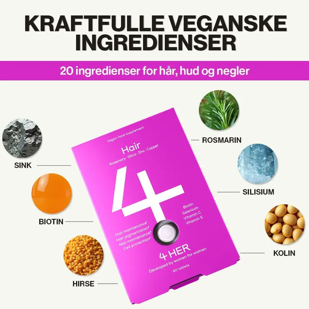 4Her Hair er et kosttilskudd utviklet spesielt for kvinner, med ingredienser som støtter hårets helse og naturlige pigmentering. Det bidrar også til normale negler og beskytter cellene mot oksidativt stress. Formelen inneholder blant annet sink, biotin og selen, som er kjent for å bidra til normalt hår, samt kobber som støtter normal hårpigmentering. I tillegg finner du rosmarin- og hirseekstrakt som gir ekstra næring.