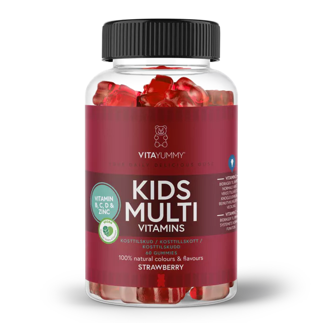 VitaYummy Kids Multivitamins er deilige, jordbærsmakende gummivitaminer som gjør det enkelt og morsomt for barn å få i seg viktige næringsstoffer hver dag. De er laget med naturlige ingredienser, fri for kunstige tilsetningsstoffer og med pektin i stedet for gelatin, perfekt for små veganske vitaminelskere.