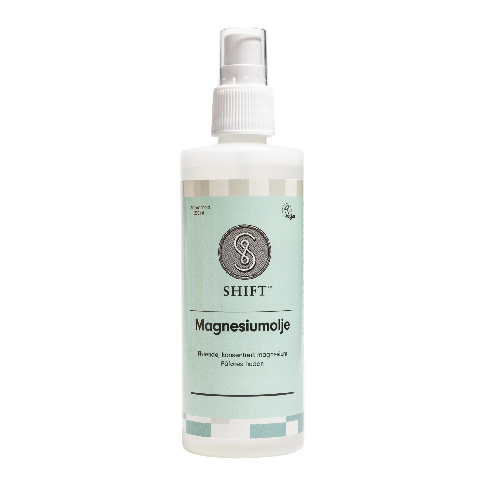 SHIFT Magnesiumolje er et flytende og konsentrert magnesiumprodukt som påføres huden. Produktet inneholder magnesiumklorid fra naturlig havvann og brukes på utvalgte områder av kroppen etter behov.