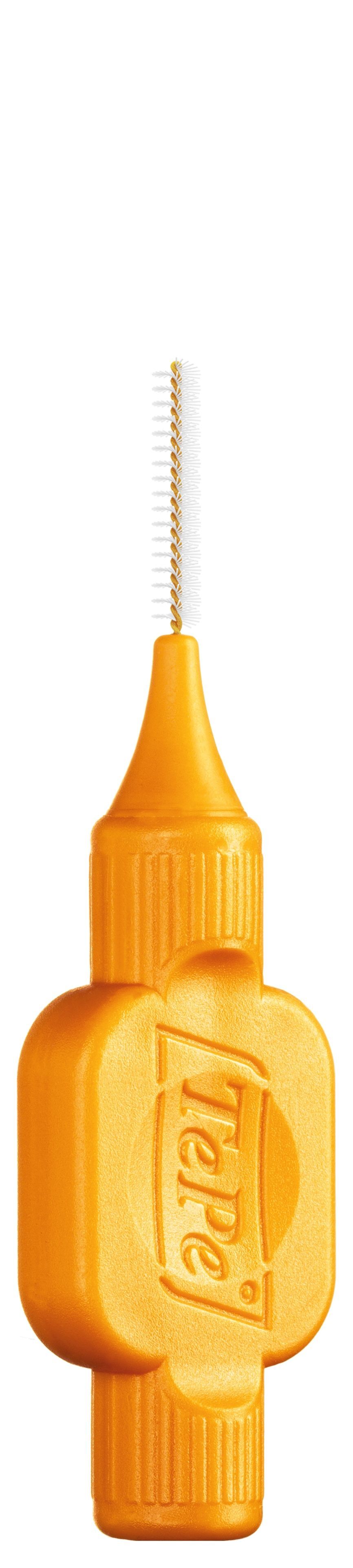Den oransje børsten har en trådstørrelse på 0,45 mm, noe som regnes som en av de mindre størrelsene. Den passer perfekt for deg med relativt smale mellomrom mellom tennene. Børsten skal gli inn med et lett trykk uten at du må tvinge den.