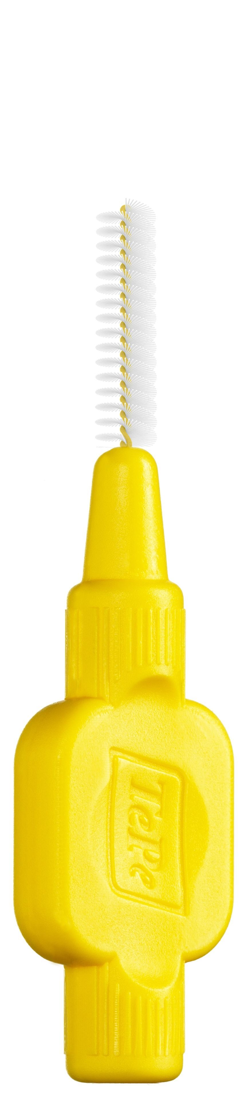 Den gule fargekoden tilsvarer en størrelse på 0,7 mm. Dette er en medium størrelse som egner seg godt for personer med tydelige mellomrom mellom tennene. Børsten skal gli inn med et lett trykk, og busten skal fylle mellomrommet for å gi best mulig rengjøringseffekt.