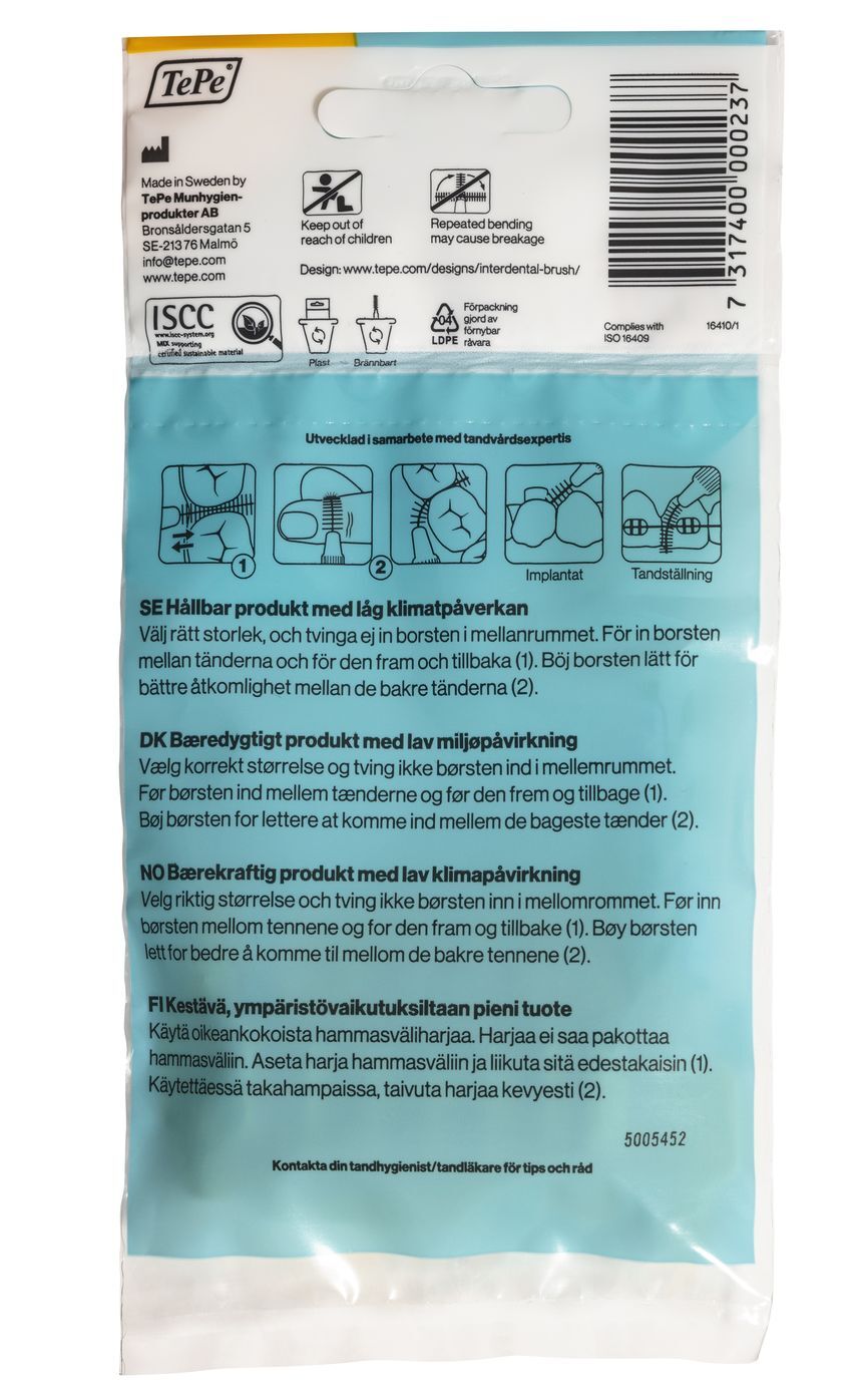 Miljømerknad: TePe produserer sine mellomromsbørster i Sverige med 100 % fornybar energi, og jobber kontinuerlig for å redusere miljøpåvirkningen gjennom bærekraftige materialvalg.