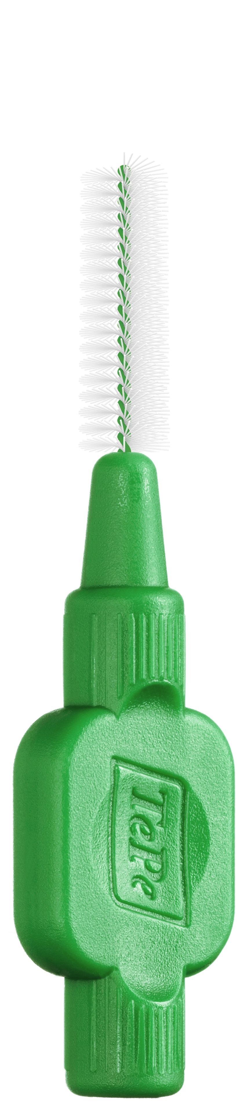 Den grønne fargekoden tilsvarer en størrelse på 0,8 mm. Dette er en medium størrelse som passer godt for de som har synlige mellomrom mellom tennene. Børsten skal gli inn med et lett trykk, men busten skal fylle hele rommet for å gi maksimal rengjøringseffekt.
