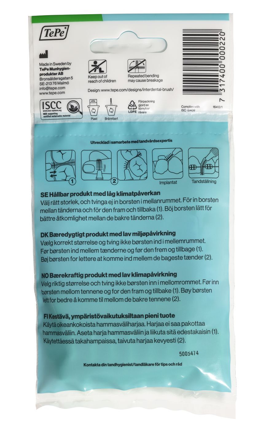 Sikkerheten er ivaretatt gjennom en plastbelagt metalltråd som er tvunnet i en løkke på toppen. Dette fjerner skarpe ender og gjør børsten svært skånsom mot både naturlige tenner, tannkjøtt og sensitive konstruksjoner som implantater, broer eller tannregulering. Det flate, ergonomiske skaftet sørger for at du har et stødig og kontrollert grep under hele rengjøringen. I tillegg er produktet et mer bærekraftig valg; ved å benytte fossilfrie talloljer i produksjonen har TePe redusert karbonavtrykket med hele 80 %.