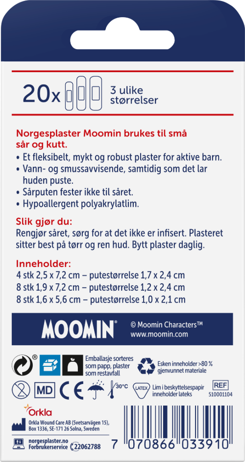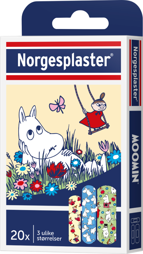 Norgesplaster Moomin er søte og populære barneplaster med kjente Mummitroll motiver, utviklet spesielt for aktive barn. Pakningen inneholder 20 plaster i tre ulike størrelser, slik at du enkelt kan velge riktig plaster til ulike typer små sår og skrubbsår.