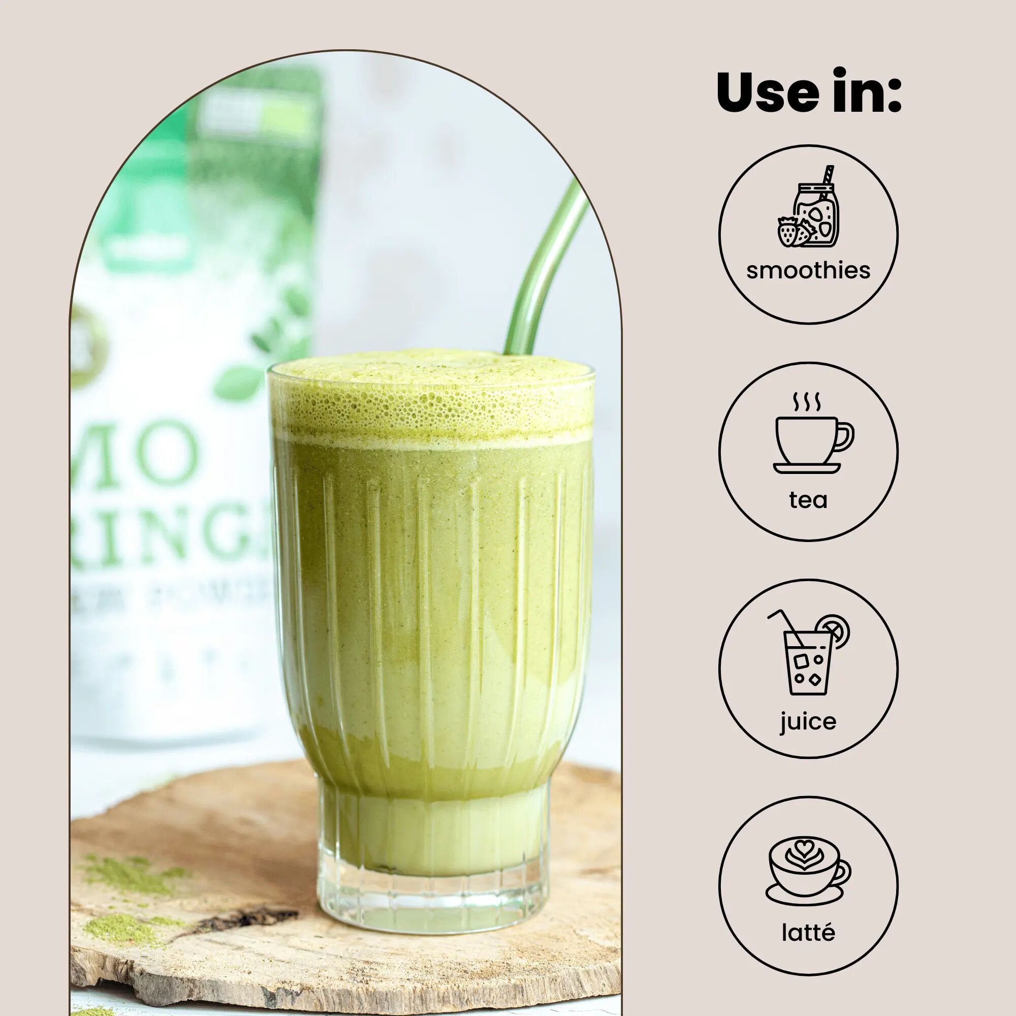 Moringabladene er naturlig rike på fiber, protein og viktige mineraler som kalsium, fosfor, jern, kalium og magnesium. Pulveret gjennomgår en skånsom kald prosessering som bidrar til å bevare næringsstoffene best mulig. Resultatet er et rent, grønt pulver med frisk smak og lette grønne toner som minner om matcha.