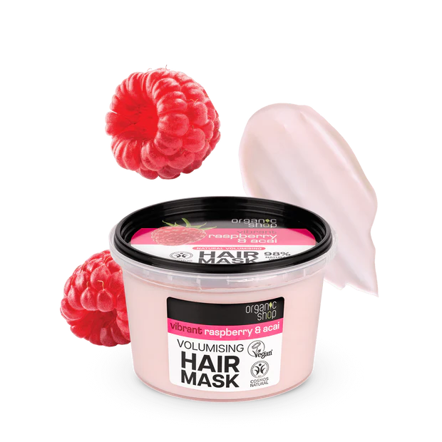 Organic Shop Raspberry & Açaí Hair Mask er en pleiende hårmaske utviklet for deg som ønsker mer fylde, glans og en friskere følelse i håret. Den kremede konsistensen gjør masken enkel å fordele i håret og gir et ekstra pleiesteg som etterlater håret velpleid og lettere å style.