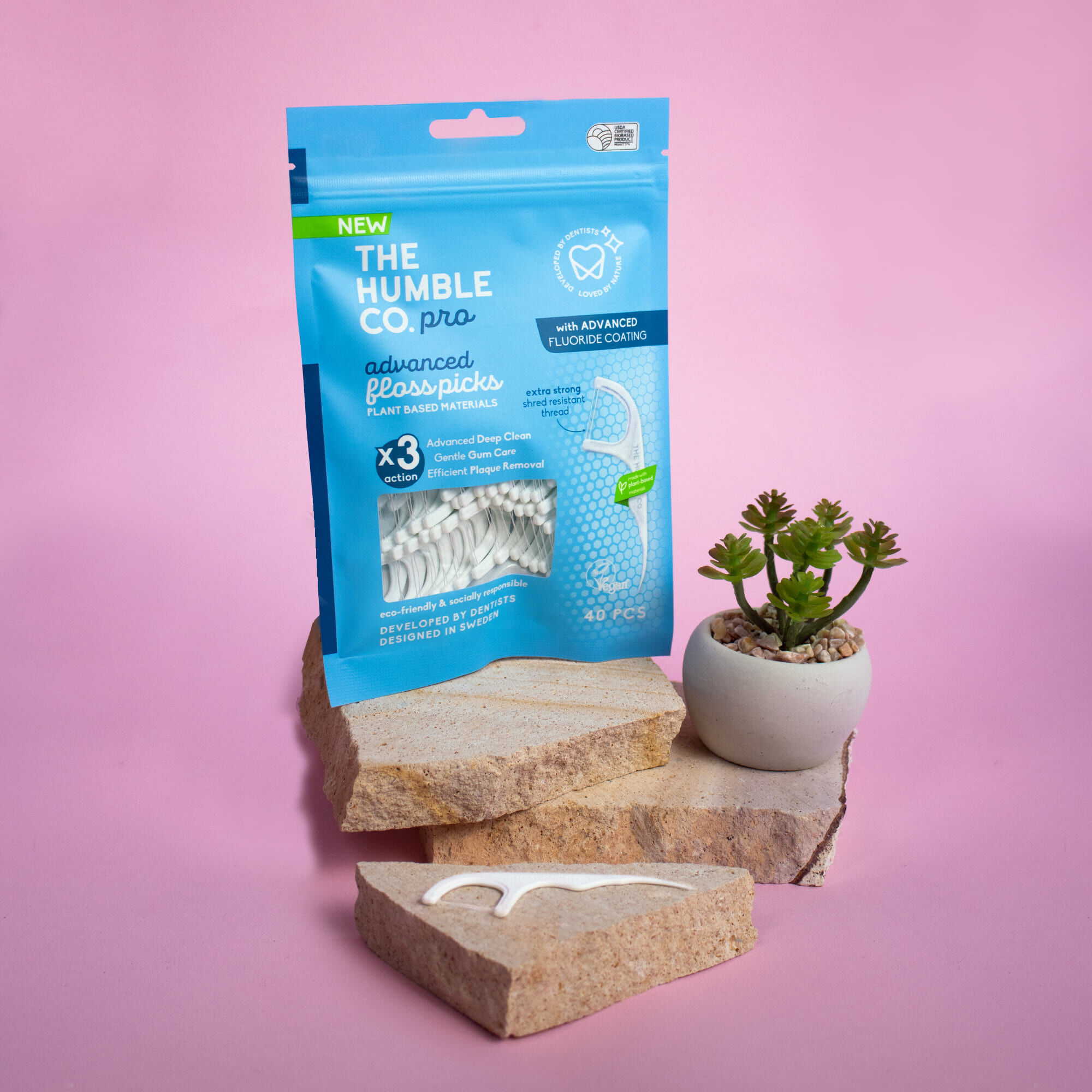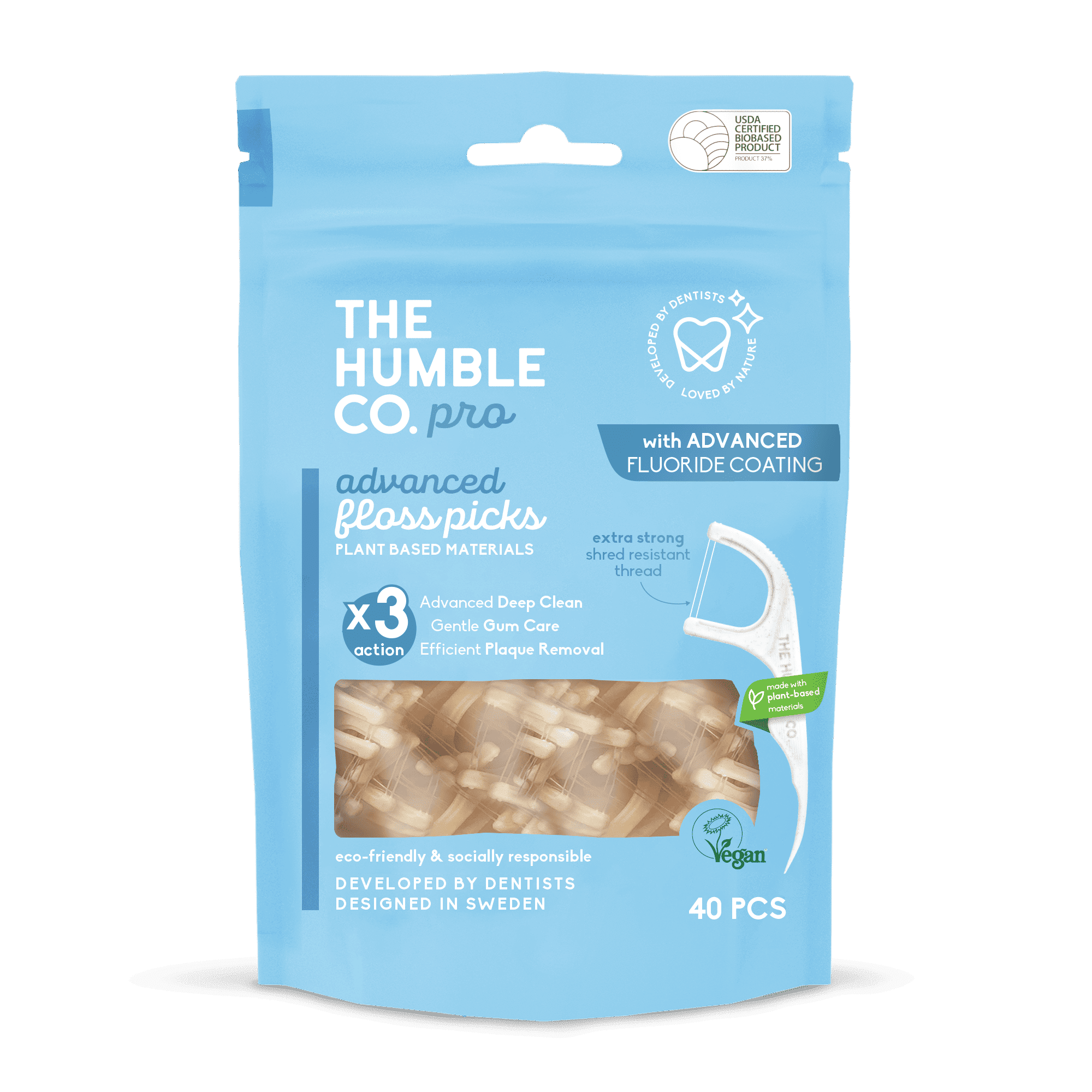 Humble Pro Floss Picks med X3 action er utviklet for en mer avansert og komplett munnpleie. De kombinerer dyprengjøring, skånsom pleie av tannkjøttet og effektiv fjerning av plakk, alt i én enkel løsning. Laget med maisstivelse som hovedingrediens, gir de et mer miljøvennlig alternativ uten å gå på kompromiss med kvalitet.