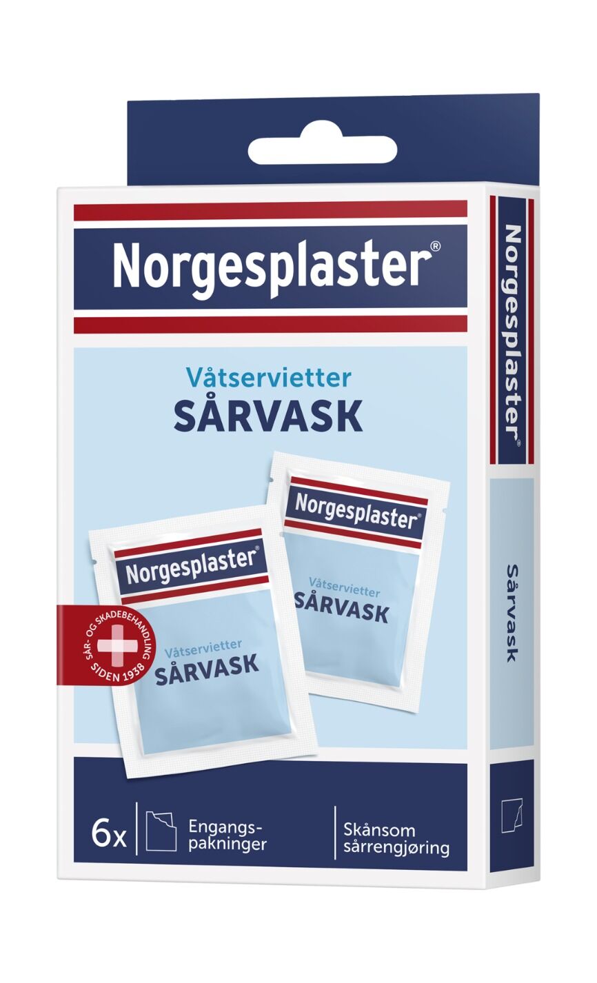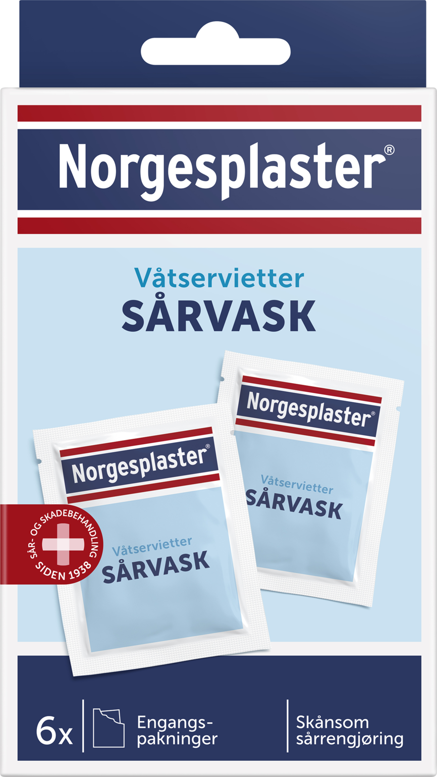Norgesplaster sårvask våtservietter er praktiske og rensende servietter utviklet for skånsom rengjøring av mindre sår. De er enkeltpakket og tar liten plass, noe som gjør dem ideelle å ha med i førstehjelpsskrinet, på tur, i bilen eller på hytta.
