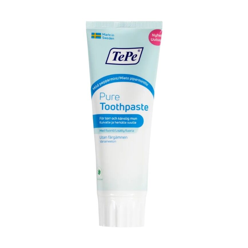 TePe Pure™ er en tannkrem spesielt utviklet for deg som opplever ubehag på grunn av sensitive munnslimhinner eller tørr munn. Mange faktorer som allergi, autoimmune tilstander eller mangel på spytt kan gjøre vevet i munnen følsomt. Denne tannkremen er laget med få og nøye utvalgte ingredienser for å gi en så skånsom rengjøring som overhode mulig, uten å irritere.