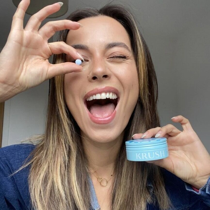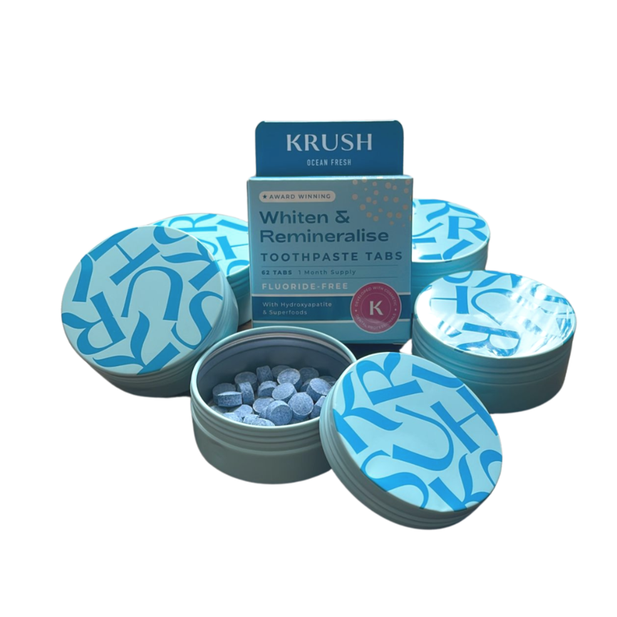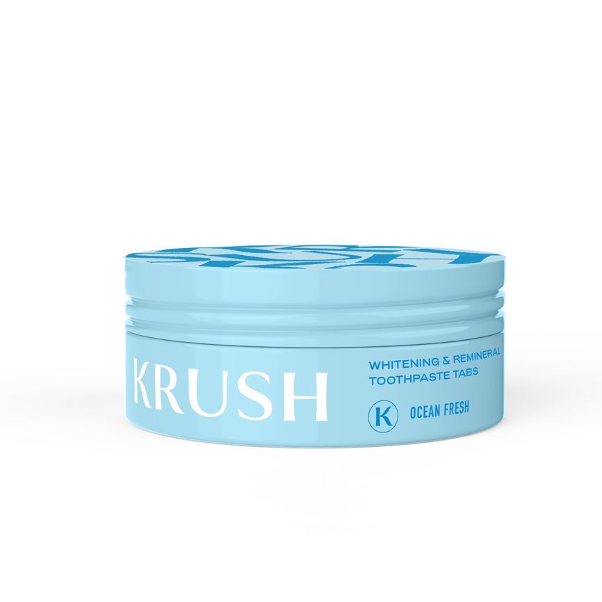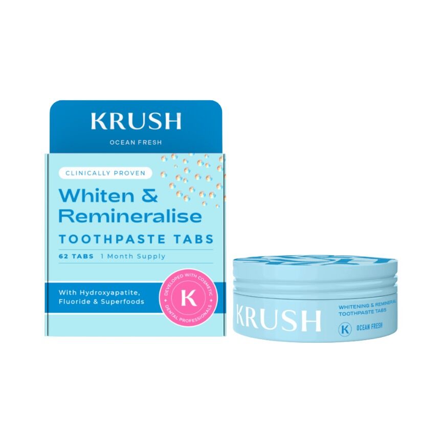 Tablettene kombinerer kraften fra 1450 ppm fluor med hydroksapatitt for å remineralisere og bygge opp tapt tannemalje. Dette gjør tennene mer motstandsdyktige mot syreangrep og bidrar til å reparere begynnende hull. Som en unik vri inneholder Krush supermatingrediensen blå spirulina, som sammen med naturlige ingredienser sørger for at tennene fremstår hvitere og friskere. Tablettene er veganske, reisevennlige og fri for syntetiske fargestoffer og SLS. I stedet brukes et naturlig skummingsmiddel fra kokosnøtt som virker fuktighetsgivende og kan lindre symptomer på munntørrhet.