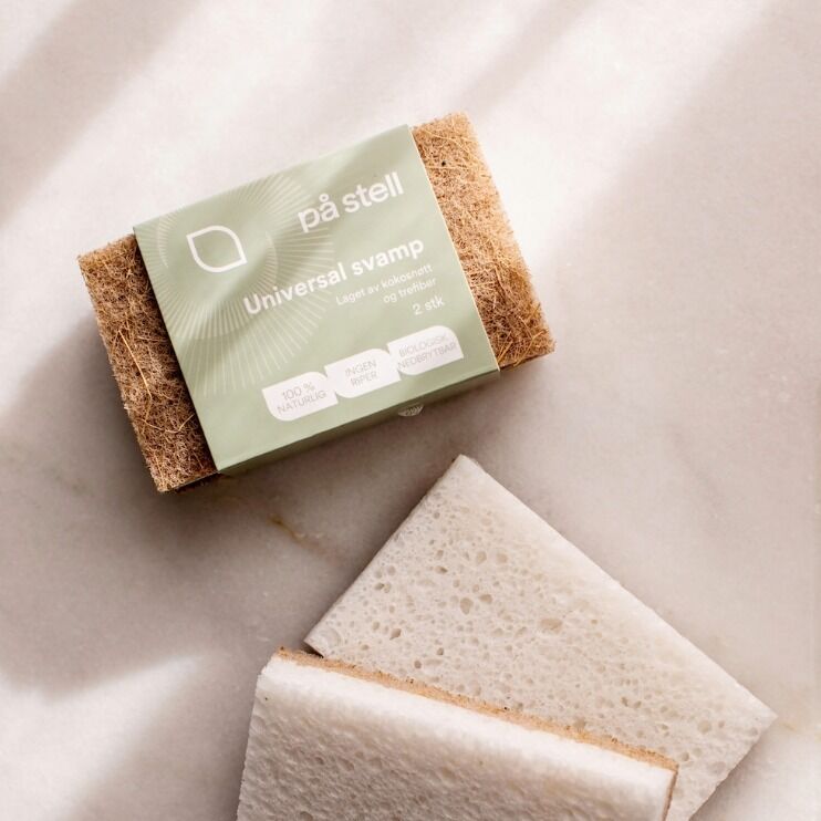 På Stell Universal Svamp er en biologisk nedbrytbar rengjøringssvamp laget av kokosnøtt og trefiber. Den har en skrubbeside som effektivt løsner vanskelige flekker og en superabsorberende side som vasker rent uten å ripe overflaten. Svampen varer lenge og kan enkelt rengjøres i oppvaskmaskin ved behov.