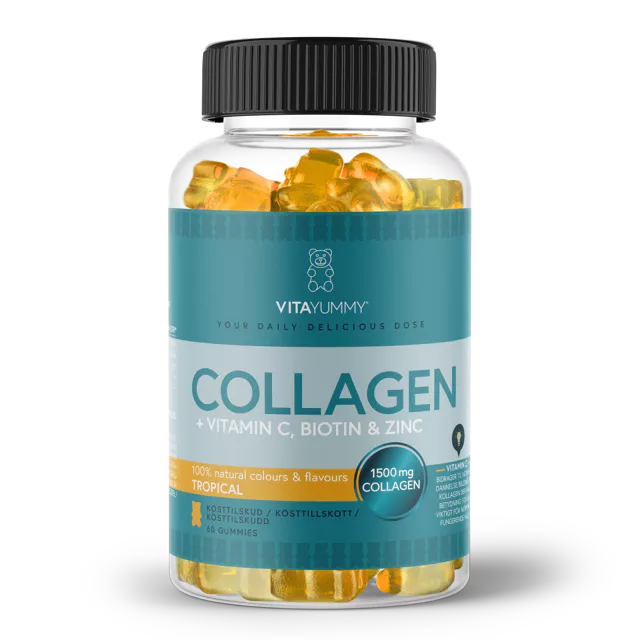 VitaYummy Collagen Tropical er et kosttilskudd i myk vingummiform med frisk smak av pasjonsfrukt. Hver porsjon inneholder 1500 mg hydrolysert kollagen fra Verisol®, kombinert med vitamin C, biotin og sink. Denne kombinasjonen er utviklet for å støtte kroppens naturlige prosesser som påvirker hud, hår, negler og bindevev. Produktet er fritt for kunstige farger, smaker og søtningsmidler.