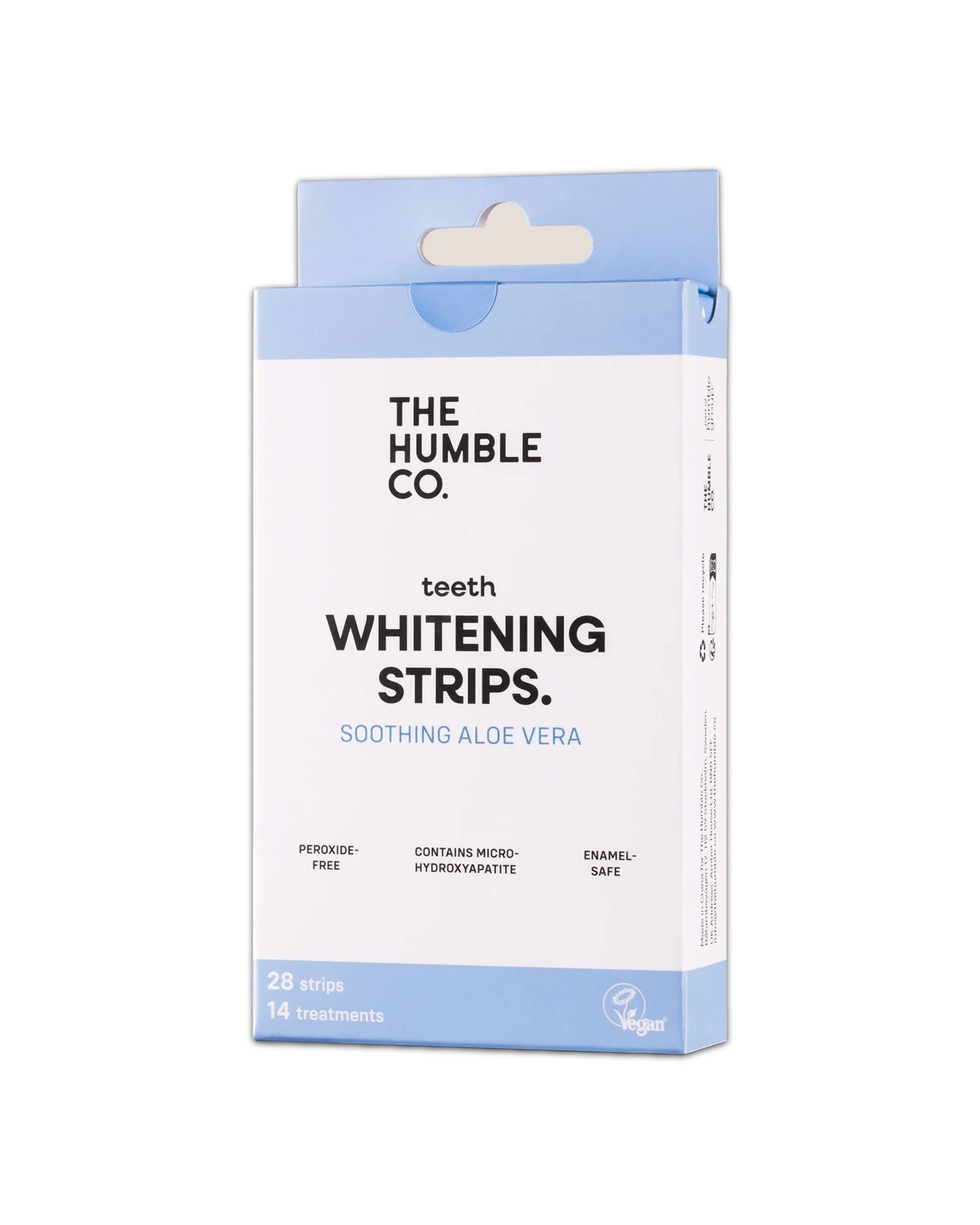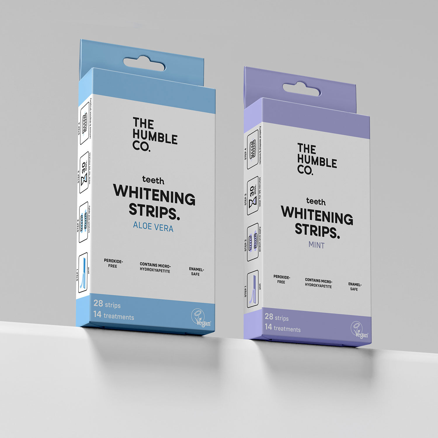 Humble Whitening Strips er utviklet med naturlige ingredienser og en peroksidfri, ikke slipende formel som beskytter emaljen og gir en skånsom tannbleking. De er ytelsestestet for synlig hvitere tenner, sertifisert av The Vegan Society og fri for PFAS.
