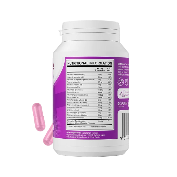 Vitamin D (kolekalsiferol), vitamin C (askorbinsyre), vitamin E (dl-alfa-tokoferylacetat), tiamin (vitamin B1), riboflavin (vitamin B2), niacin (vitamin B3), vitamin B6 (pyridoksin), folat (folsyre), vitamin B12 (cyanokobalamin), biotin (vitamin B7), pantotensyre (vitamin B5), kalsium, magnesium (magnesiumoksid), jern, sink (sinksulfat), kobber, selen (selenometionin), jod, fertilitetsblanding (inositol, L-argininbase, cystein, taurin). Kapsel: vegetabilsk kapsel, sinkoksid (tidligere titandioksid), potetstivelse, solsikkeolje. Ingen konserveringsmidler. Fri for hvete og gluten.